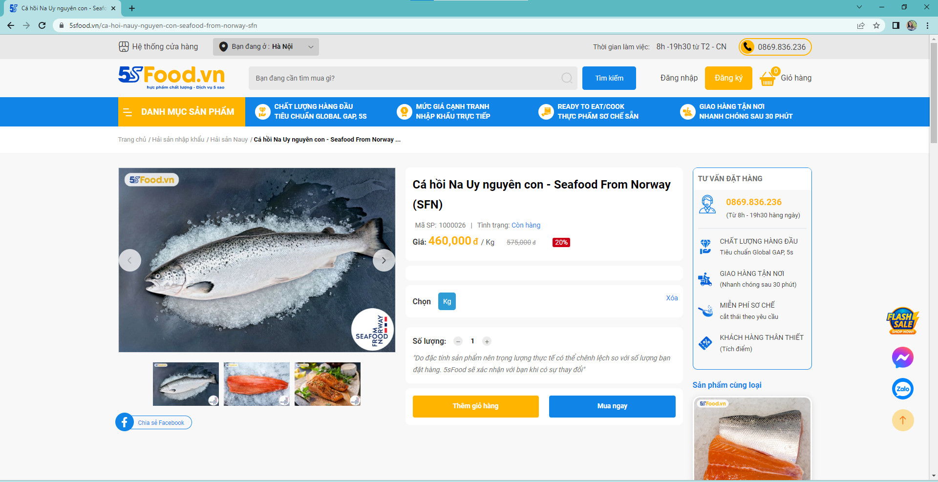 Cách 2: Gọi điện thoại đến Hotline 0869 836 236 - 0869 235 366 từ 8h00-190h30, 5sFood luôn sẵn sàng phục vụ bạn.